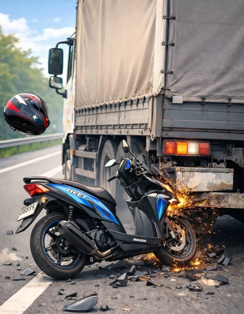 Sesampai di tempat kejadian peristiwa, motor hendak mendahului dari samping kanan. Diduga saat itu ruang gerak tidak bebas dan ruang gerak tidak cukup.