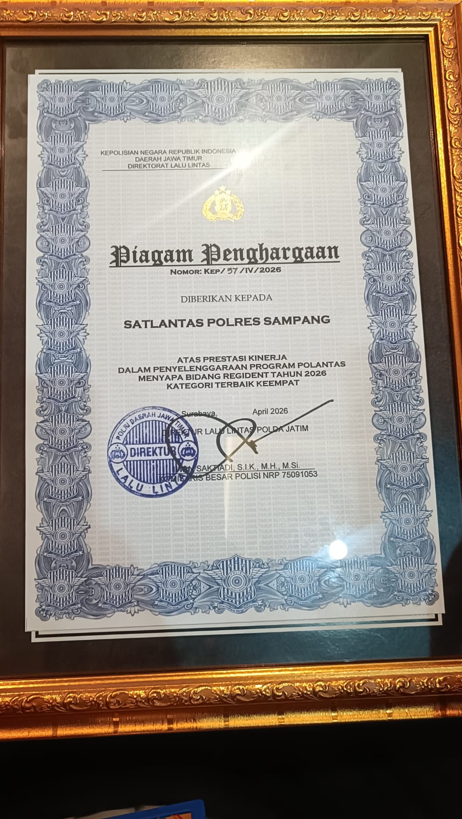 Publikasiterkini° Sampang _ ​Satuan Lalu Lintas (Satlantas) Polres Sampang mengukuhkan posisinya sebagai salah satu satuan kerja berprestasi di jajaran Kepolisian Daerah Jawa Timur. Prestasi ini ditandai dengan raihan Piagam Penghargaan sebagai Terbaik Ke-4 dalam penyelenggaraan Program Polantas Menyapa Bidang Registrasi dan Identifikasi (Regident) Tahun 2026.