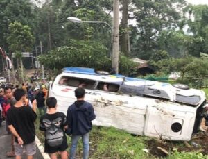 Minibus Elf Rombongan Wisatawan Surabaya Terguling di Jalur Cangar–Pacet, 16 Orang Luka-luka
