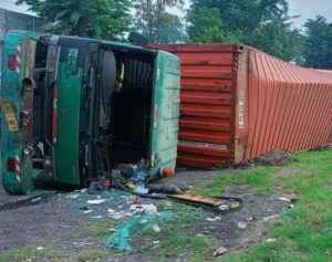 Truk Trailer Bermuatan Kayu Palet Terguling di Balongbendo Sidoarjo